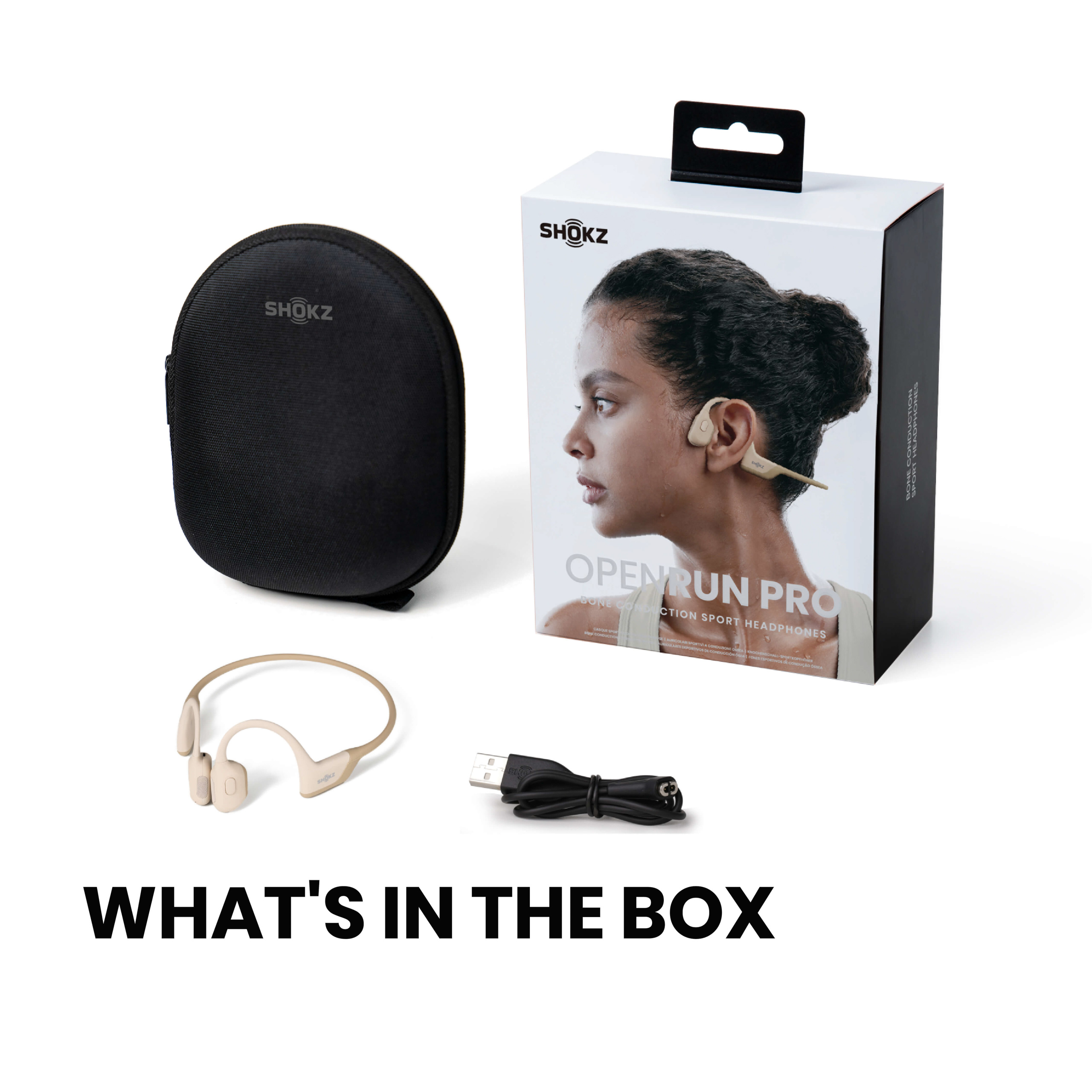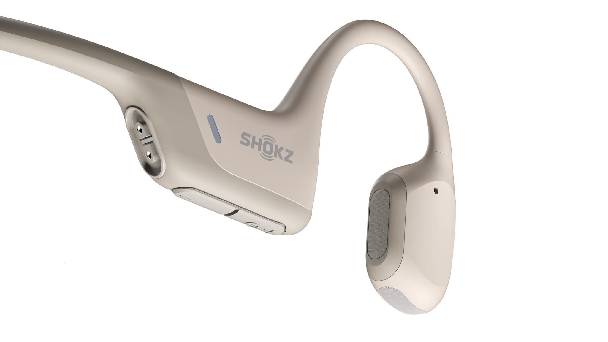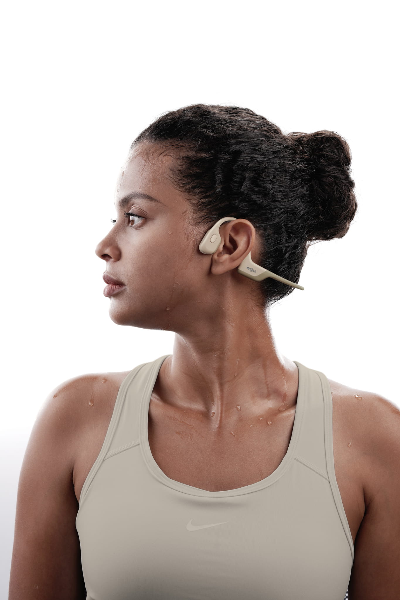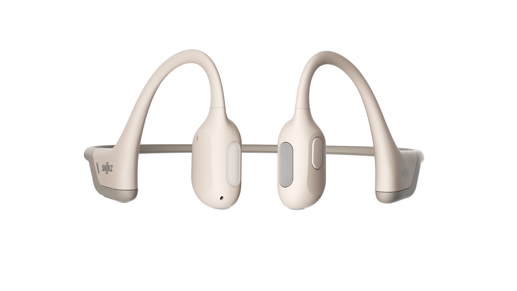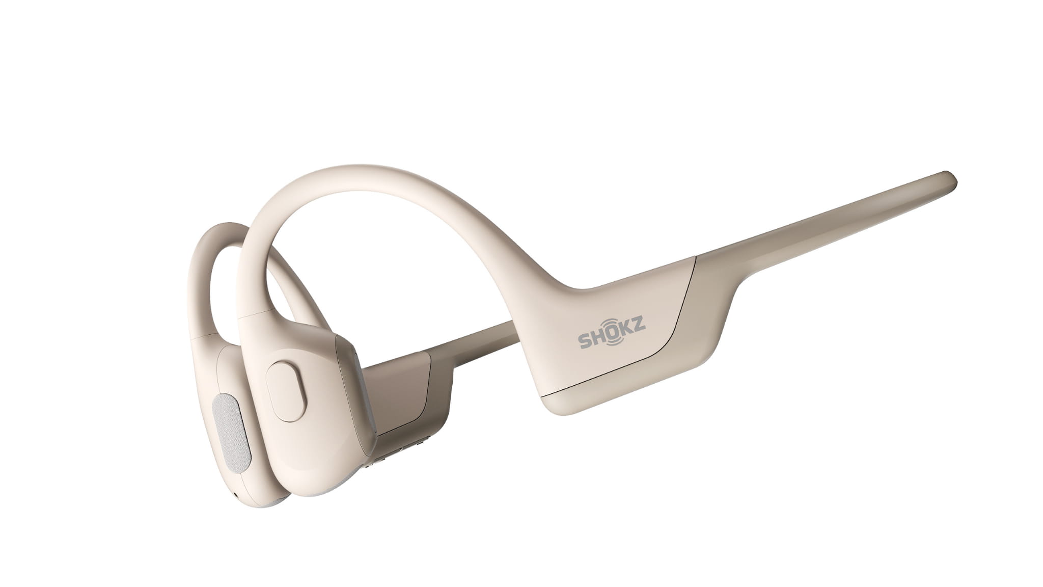 Słuchawki w technologii przewodnictwa kostnego Shokz OpenRun Pro w kolorze beżowym w wersji Mini.