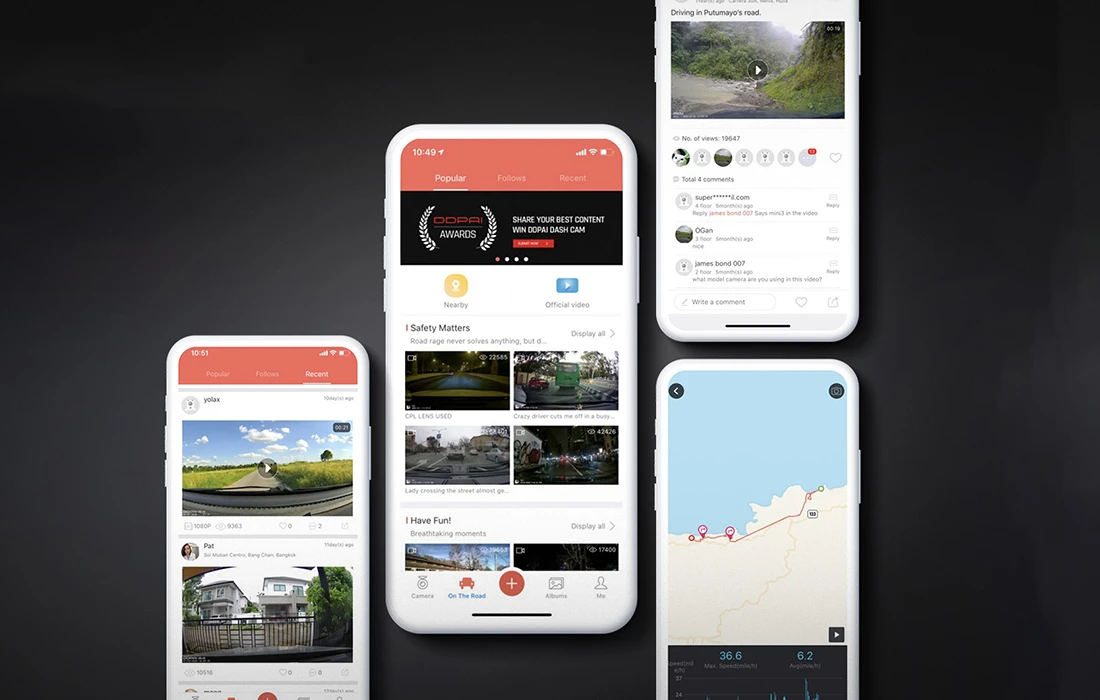 Chcesz więcej? Zainstaluj aplikację DDPAI i odkryj dostępne w niej funkcje. Za jej pomocą możesz nie tylko zmieniać ustawienia kamery i odtwarzać nagrane materiały, ale też edytować filmy i udostępniać je znajomym. To nie wszystko! Funkcja SR2.0 w czasie rzeczywistym dostarcza dynamicznych danych jazdy, takich jak na przykład prędkość. Ponad 3-milionowa społeczność DDPAI umożliwia szybką i wygodną wymianę informacji, a także dzielenie się wrażeniami, zdjęciami i filmami z podróży.